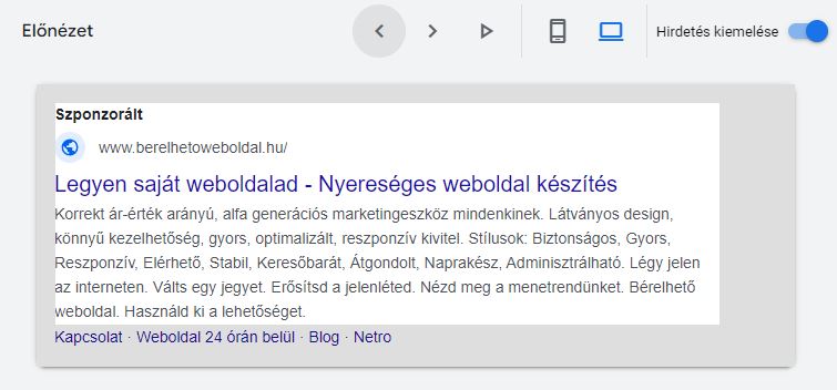 Egy normális keresési találathoz hasonlóan az előbbiek fognak megjelenni a keresési találatok közt nagybetűkkel, kötőjelekkel elválasztva, az utóbbiak alattuk apróbetűkkel. Szükségünk lesz továbbá weboldalunk címére, ahova a látogató a hirdetésre kattintva érkezni fog. A Google a címszavakat és a leírásokat különböző kombinációkban fogja megjeleníteni. Általánosságban célszerű, de nem kötelező, ilyenkor minden mezőt kitöltenünk, vagyis adni minden hirdetésnek 15 egyedi címsort és 4 egyedi leírást. Fontos, hogy a címsorok frappánsan és egyértelműen leírják hirdetett vállalkozásunkat, megragadják a lehetséges ügyfelek figyelmét és egyértelművé tegyék nekik, mit hirdetünk, és célszerű tartalmazniuk a kulcsszavakat, amelyekre rákeresve megtalálhatóak.